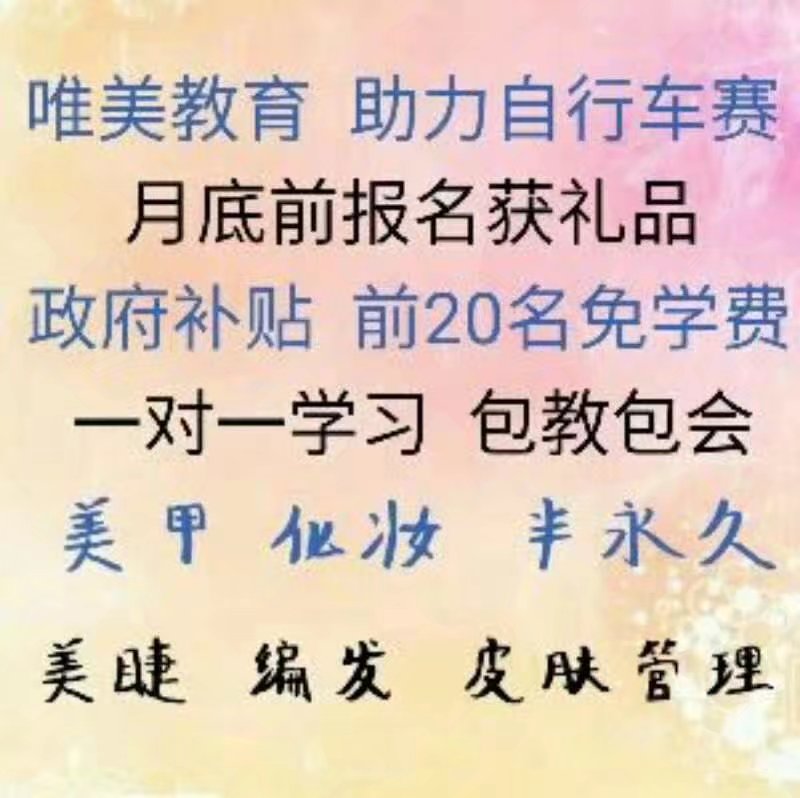 驚喜 驚喜 特大驚喜 唯美教育學(xué)校為迎接 邢臺自行車賽 特為愛美人士重推出以下助學(xué)活動: 凡在活動期間外地需住宿學(xué)習(xí)的學(xué)員報名,即可獲得免住宿費1 個月 凡在活動期間報名學(xué)習(xí)的寶媽,均可為自己親愛的寶寶獲得超級可愛書包1 個 凡在活動期間報名學(xué)習(xí)的單身女孩或已婚但未當(dāng)寶媽學(xué)員,可獲得超級大超級可愛的1.6米泰迪熊或1.6米瞌睡熊毛絨玩具1 個(每個均有7 個顏色可選哦) 活動時間:2017 年8 月11 日——2017年8 月31 日 只要你愛美 只要你愛好 只要你愛學(xué) 只要你喜歡 那麼就不要再猶豫了 機會不多,失不再來 心動不如行動,趕緊行動吧