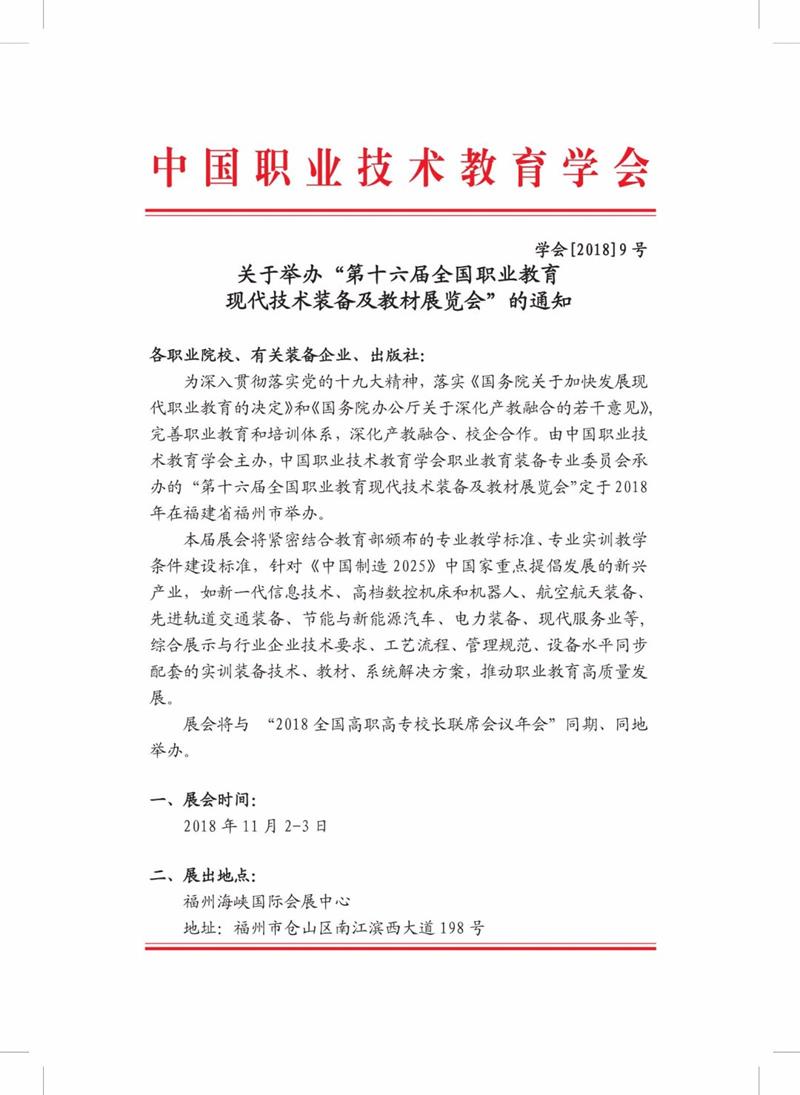 由中國職業(yè)技術(shù)教育學(xué)會(huì)主辦,中國職業(yè)技術(shù)教育學(xué)會(huì)職業(yè)教育裝備專業(yè)委員會(huì)承辦的“第十六屆全國職業(yè)教育現(xiàn)代技術(shù)裝備及教材展覽會(huì)”定于2018年在福建省福州市舉辦,本屆展會(huì)將緊密結(jié)合教育部頒布的專業(yè)教學(xué)標(biāo)準(zhǔn)、專業(yè)實(shí)訓(xùn)教學(xué)條件建設(shè)標(biāo)準(zhǔn),針對《中國制造2025) 中國家重點(diǎn)提倡發(fā)展的新興產(chǎn)業(yè),如新一代信息技術(shù)、高檔數(shù)控機(jī)床和機(jī)器人、航空航天裝備、先進(jìn)軌道交通裝備、節(jié)能與新能源汽車、電力裝備、現(xiàn)代服務(wù)業(yè)等,綜合展示與行業(yè)企業(yè)技術(shù)要求、工藝流程、管理規(guī)范、設(shè)備水平同步配套的實(shí)訓(xùn)裝備技術(shù)、教材、系統(tǒng)解決方案,推動(dòng)職業(yè)教育高質(zhì)量發(fā)展。