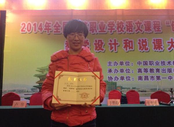 喜訊:2014全國(guó)中等職業(yè)學(xué)校大賽、唐山市第一職業(yè)中專教師榮獲第一,唐山市第一職業(yè)中專張盈老師代表唐山市中等職業(yè)學(xué)校參加了11月15日-17日在江西南昌舉辦的“2014全國(guó)中等職業(yè)學(xué)校語(yǔ)文課程創(chuàng)新杯教師信息化教學(xué)設(shè)計(jì)和說課大賽”,以其富有創(chuàng)新特色的教學(xué)設(shè)計(jì)和精彩的說課展示獲得了一等獎(jiǎng)的優(yōu)異成績(jī)。