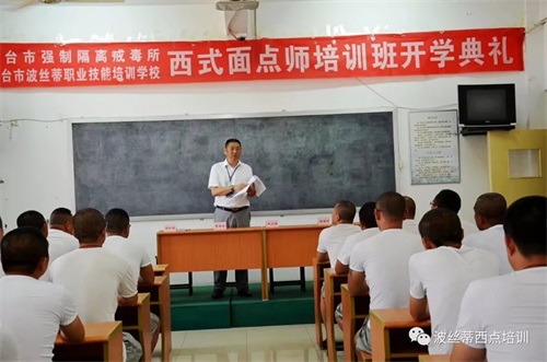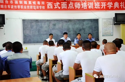 為進(jìn)一步擴(kuò)大煙臺市強(qiáng)制隔離戒毒所“文化育人”管理新模式的成效,鼓勵戒毒學(xué)員積極參與習(xí)藝活動,掌握一定的就業(yè)謀生技能,幫助他們盡快融入社會。近日,2019年首期煙臺市強(qiáng)制隔離戒毒所西式面點(diǎn)班在煙臺波絲蒂學(xué)校開班了,此次培訓(xùn)是煙臺市人力資源和社會保障局公共就業(yè)和人才服務(wù)中心、煙臺市強(qiáng)制隔離戒毒所聯(lián)合煙臺市波絲蒂職業(yè)技能培訓(xùn)學(xué)校共同舉辦,煙臺市人力資源和社會保障局公共就業(yè)和人才服務(wù)中心培訓(xùn)科李科長,煙臺市強(qiáng)制隔離戒毒所劉所長,教育科李科長,波絲蒂西點(diǎn)培訓(xùn)學(xué)校陳校長共同出席了開班儀式。