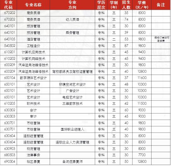 學(xué)校著力加強品牌、質(zhì)量和特色建設(shè),開設(shè)了會計、審計、工程造價、旅游管理、商務(wù)英語、自閉癥康復(fù)師等重點專業(yè),形成了金融、房地產(chǎn)、科技與信息服務(wù)、旅游、教育培訓(xùn)等現(xiàn)代服務(wù)產(chǎn)業(yè)專業(yè)群;開設(shè)了藝術(shù)設(shè)計、數(shù)字媒體藝術(shù)等重點專業(yè),形成了動漫、廣告設(shè)計、現(xiàn)代傳媒設(shè)計、數(shù)字媒體設(shè)計等文化創(chuàng)意專業(yè)群;開設(shè)了計算機軟件技術(shù)、計算機網(wǎng)絡(luò)技術(shù)等重點專業(yè),形成了計算機應(yīng)用技術(shù)、軟件服務(wù)外包等高新技術(shù)專業(yè)群;開設(shè)了汽車運用與維修技術(shù)等重點專業(yè),形成了汽車及相關(guān)產(chǎn)業(yè)的汽車運用與汽車服務(wù)專業(yè)群。學(xué)校堅持以校企合作為抓手,通過與行業(yè)、企業(yè)合作,為學(xué)生優(yōu)質(zhì)就業(yè)創(chuàng)造條件;已經(jīng)與多家企業(yè)建立校企合作、定向培養(yǎng)、訂單服務(wù)的合作關(guān)系。