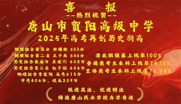 唐山市賀陽高級中學(xué)簡介 唐山市賀陽高級中學(xué)位于河北省唐山市曹妃甸區(qū)大學(xué)城,是由曹妃甸區(qū)精心考察后從衡水市引進的重點教育投資項目。學(xué)校由知名教育家創(chuàng)辦,由全國名師、全國模范教師、中學(xué)正高級教師擔任校長,引領(lǐng)學(xué)校發(fā)展。學(xué)校自成立以來紼,始終秉持著對教育品質(zhì)的不懈追求,持續(xù)優(yōu)化校園環(huán)境,不斷完善學(xué)校設(shè)施,致力于為莘莘學(xué)子打造更為優(yōu)質(zhì)舒適的學(xué)習(xí)與生活空間。寬敞整潔的宿舍,窗明幾凈的食堂,為學(xué)生們營造了溫馨宜人的生活氛圍,有力地保障了他們能夠全身心地投入到學(xué)習(xí)之中。 賀陽高級中學(xué)是一所起點高、標準嚴、管理精的寄宿制學(xué)校,校園占地廣闊,達 300余畝,..
