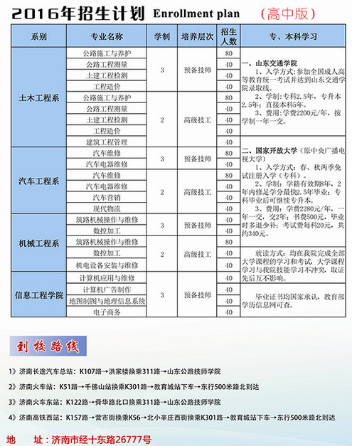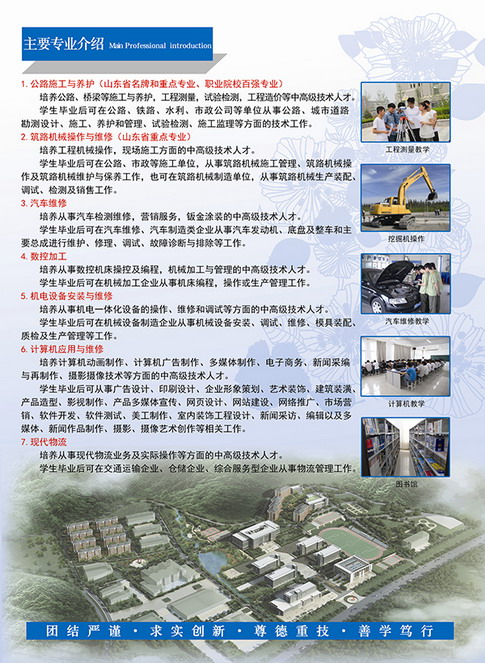 山東公路技師學(xué)院簡(jiǎn)介 山東公路技師學(xué)院直屬于山東省交通運(yùn)輸廳,是一所以培養(yǎng)交通行業(yè)高技能人才為主,集職工培訓(xùn)、成人教育、技能鑒定、駕駛培訓(xùn)和智慧交通技術(shù)應(yīng)用與試驗(yàn)于一體的綜合性公辦全日制技師學(xué)院。 學(xué)院目前兩地三區(qū)辦學(xué),主校區(qū)、無影山校區(qū)和德州校區(qū),其中主校區(qū)坐落在濟(jì)南市經(jīng)十東路,交通便利,設(shè)施設(shè)備先進(jìn)齊全,環(huán)境優(yōu)美??傉嫉孛娣e700余畝,建筑面積16萬平方米,現(xiàn)有教職工300余人,在校生達(dá)12000余人。學(xué)院設(shè)有公路工程系、運(yùn)輸工程系、汽車工程系、智能控制系、信息與管理工程系、基礎(chǔ)部、智慧交通技術(shù)應(yīng)用與試驗(yàn)中心五系一部一中心,常設(shè)專業(yè)37個(gè)。 學(xué)院19..