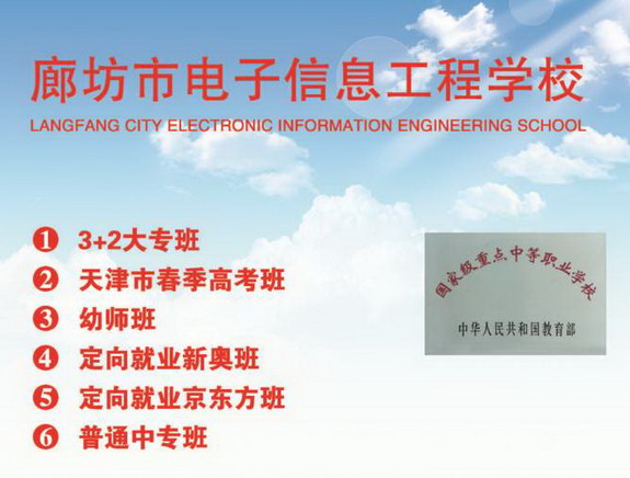 相關(guān)學(xué)校鏈接: 保定新興工業(yè)技工學(xué)校招生簡章 保定華中技工學(xué)校-保定華中技校招生簡章 中國輕工機(jī)電工程學(xué)校 中國輕工集團(tuán)高級技工學(xué)校招生簡章 廊坊市電子信息工程學(xué)校,又名廊坊市職業(yè)技術(shù)教育中心,是集普通中專、五年一貫制大專和各類短訓(xùn)班為一體的國家級重點(diǎn)中等職業(yè)學(xué)校。 學(xué)校設(shè)有汽車電子技術(shù)應(yīng)用、汽車運(yùn)用與維修、電氣技術(shù)應(yīng)用、電子與信息技術(shù)、電子技術(shù)應(yīng)用、計算機(jī)應(yīng)用、計算機(jī)動漫與游戲制作、會計電算化、電子商務(wù)、物流服務(wù)與管理、旅游服務(wù)與管理、學(xué)前教育12個專業(yè)。 合作企業(yè)多:電子信息類專業(yè)以世界500強(qiáng)的華為、北京京東光電科技有限公司、諾基亞(中國)..