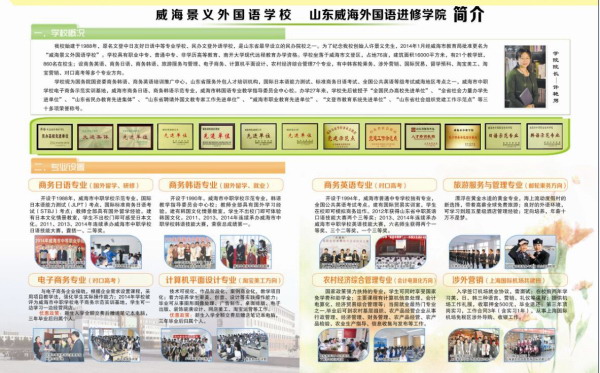 山東威海外國(guó)語(yǔ)進(jìn)修學(xué)院學(xué)校概況 山東威海外國(guó)語(yǔ)進(jìn)修學(xué)院(威海景義外國(guó)語(yǔ)學(xué)校)始建于1988年,學(xué)校始建于1988年,原名文登中日友好日語(yǔ)中等專業(yè)學(xué)校、民辦文登外語(yǔ)學(xué)校,是山東省早創(chuàng)設(shè)的民辦外語(yǔ)院校。學(xué)校具有職業(yè)中專、普通中專、非學(xué)歷高等教育、南開大學(xué)現(xiàn)代遠(yuǎn)程教育辦學(xué)資格。 山東威海外國(guó)語(yǔ)進(jìn)修學(xué)院坐落于威海市文登區(qū),占地76畝,建筑面積16000平方米,教學(xué)班30個(gè),在校生1000余名,其中外國(guó)留學(xué)生32人;教職員工61人,其中外教5人。設(shè)商務(wù)英語(yǔ)、商務(wù)日語(yǔ)、商務(wù)韓語(yǔ)、電子商務(wù)、計(jì)算機(jī)平面設(shè)計(jì)、農(nóng)村經(jīng)濟(jì)綜合管理等專業(yè),其中商務(wù)韓語(yǔ)、日語(yǔ)專業(yè)系威海市中等職業(yè)技術(shù)學(xué)校..
