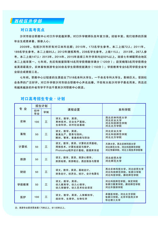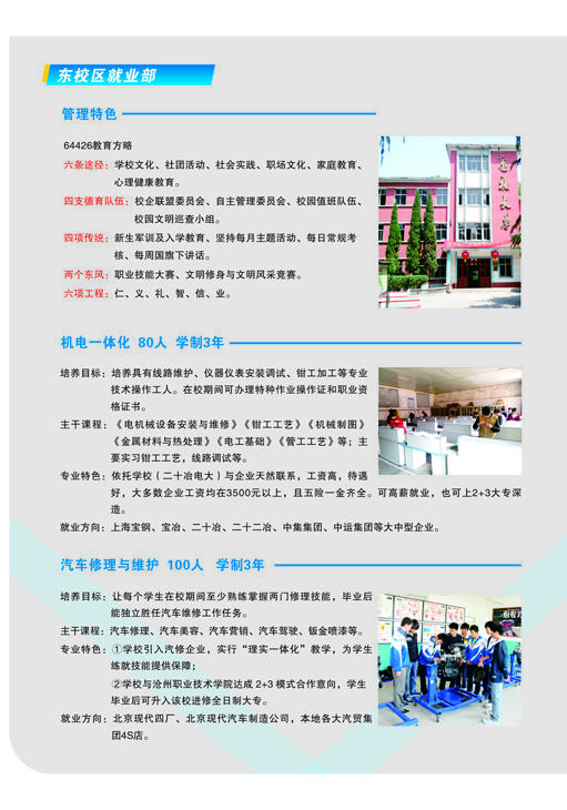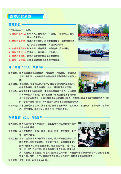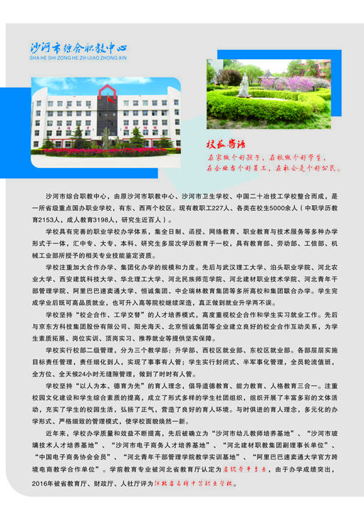 河北省沙河市綜合職教中心介紹 河北沙河市綜合職教中心始建于1995年,2011年7月沙河市人民政府將原二十冶技校(含邢臺(tái)機(jī)械電子工程學(xué)校)、原沙河市衛(wèi)生學(xué)校合并到沙河市綜合職教中心。 整合后的職教中心以“先搭建框架,再豐滿血肉”為辦學(xué)思路,通過開展多資質(zhì)、多層次、多形式、多類別辦學(xué),逐步構(gòu)建起全日制學(xué)歷教育、成人教育和職業(yè)培訓(xùn)并舉的立體職教框架,形成了學(xué)歷教育與職業(yè)培訓(xùn)規(guī)模大體相當(dāng),全日制中職教育與成人教育規(guī)模大體相當(dāng)、升學(xué)教育與就業(yè)教育規(guī)模大體相當(dāng)?shù)霓k學(xué)格局。 河北省沙河市綜合職教中心占地99101平方米(148.6畝),分為東、西兩個(gè)校區(qū),總建筑面積為..