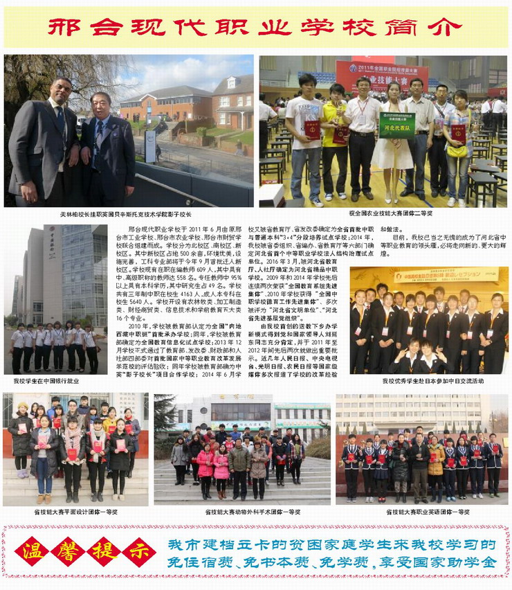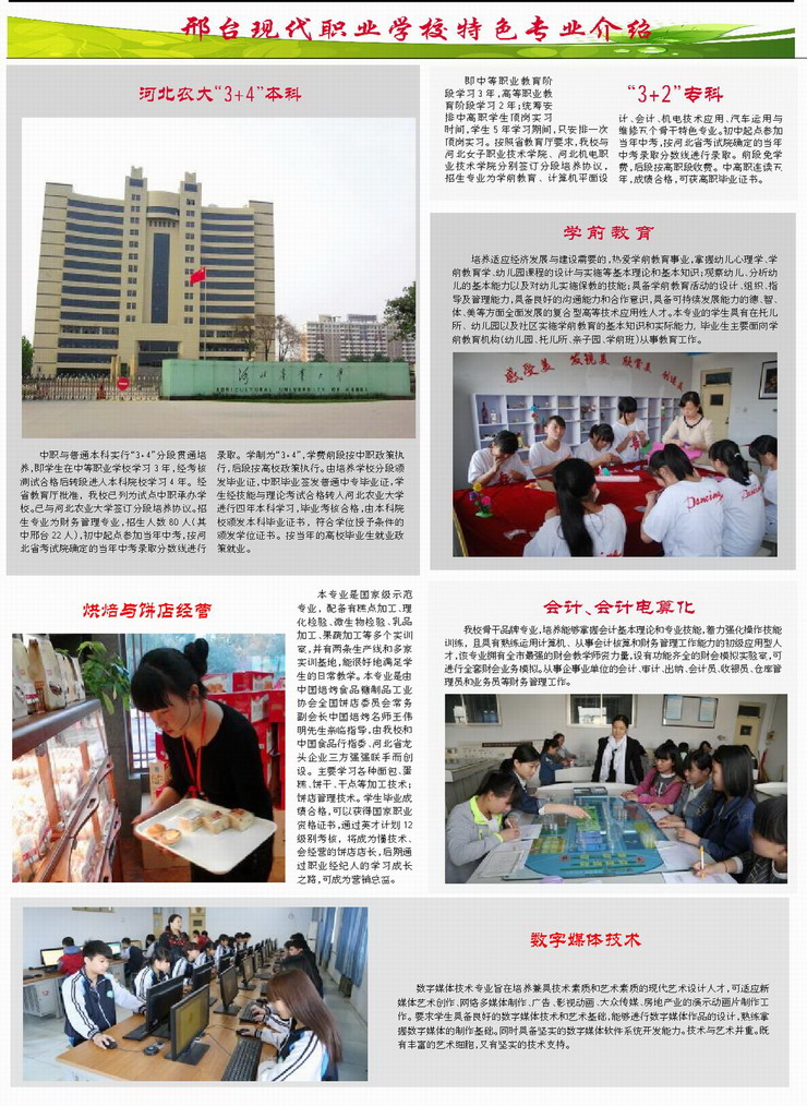 相關(guān)學校推薦: 冀中工程技師學院招生簡章 邯鄲工程高級技工學校招生簡章 邯鄲經(jīng)濟管理中等專業(yè)學校招生簡章 邯鄲華博中等專業(yè)學校招生簡章 ☆全國教育系統(tǒng)先進集體 ☆全國德育工作先進集體 ☆首批國家中等職業(yè)教育改革發(fā)展示范校 ☆河北省首批中職與普通本科“3+4”分段培養(yǎng)試點學校 ☆全國教育信息化試點學校 邢臺現(xiàn)代職業(yè)學校簡介: 邢臺現(xiàn)代職業(yè)學校于2011年6月由原邢臺市工業(yè)學校、邢臺市農(nóng)業(yè)學校、邢臺市財貿(mào)學校聯(lián)合組建而成的一所國辦中職學校。學校分為北校區(qū)、新校區(qū)。其中新校區(qū)占地500余畝,環(huán)境優(yōu)美,設施完善,工科專業(yè)部、農(nóng)科專業(yè)部和學前教育部先后遷入新校區(qū)。 ..