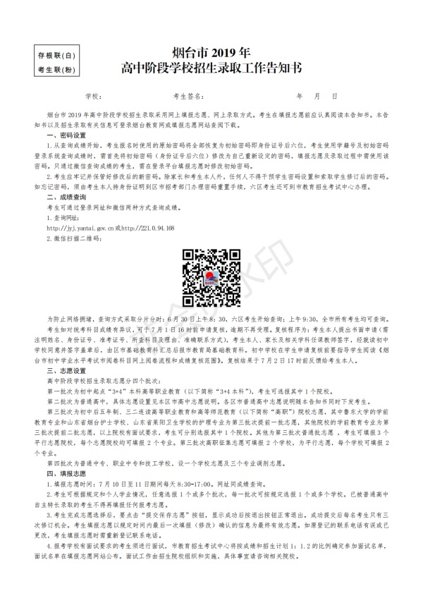 2019年山東煙臺(tái)中考普通高中招生錄取告知書公布了,招生錄取時(shí)間:7月17日至7月23日。具體內(nèi)容如下所示: