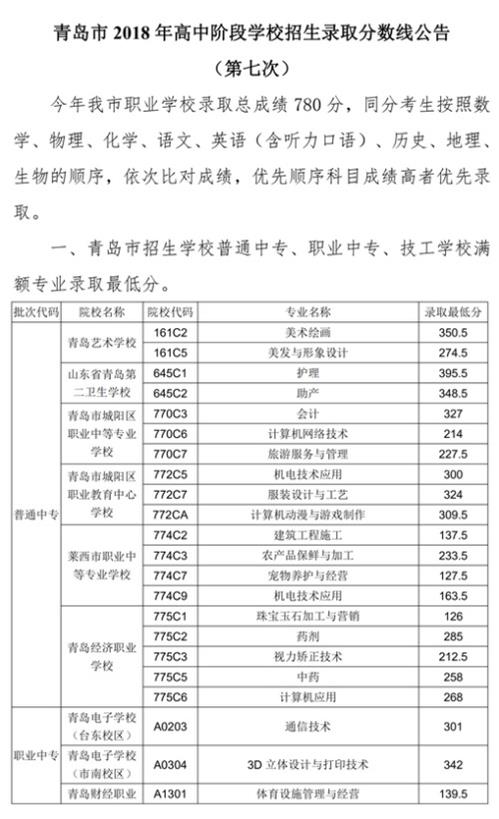 2018年青島市中專、中職招生錄取分?jǐn)?shù)線公告