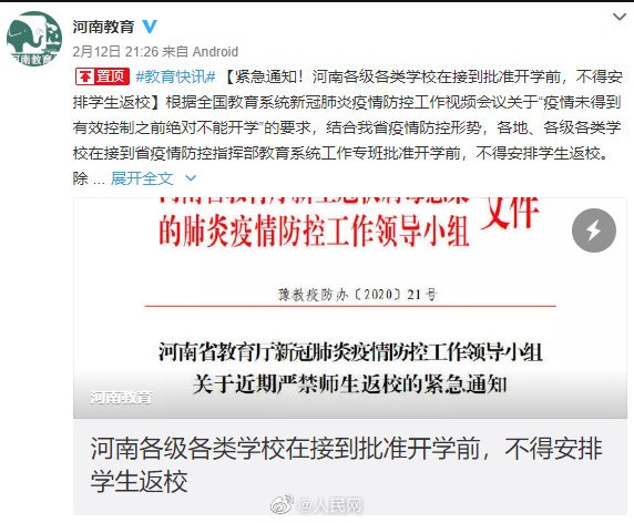 【開(kāi)學(xué)時(shí)間待定!河南各地不得安排學(xué)生返?!?河南教育緊急通知:各地、各級(jí)、各類(lèi)學(xué)校在接到省疫情防控指揮部教育系統(tǒng)工作專(zhuān)班批準(zhǔn)開(kāi)學(xué)前,不得安排