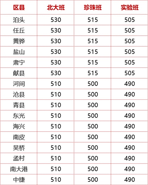 2020年河北滄州各縣市中考錄取分?jǐn)?shù)線公布 滄州一中 錄取參考線(文化分) 1、滄州市區(qū) 北大班:542分 珍珠班:530 分 實(shí)驗(yàn)班:以教育局公布為準(zhǔn) 2、滄州