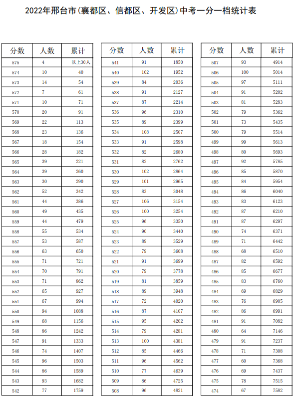 河北邢臺(tái)中考成績一分一檔公布 2022年邢臺(tái)市 (襄都區(qū)、信都區(qū)、開發(fā)區(qū)) 中考成績一分一檔表 中考考分?jǐn)?shù)在550分及以上考生數(shù)量為1088人