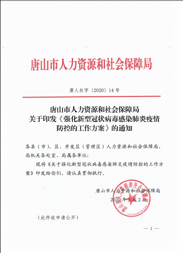 • 唐山市人社局關(guān)于印發(fā)《強化新型冠狀病毒感染的肺炎疫情防控的工作方案》的通知