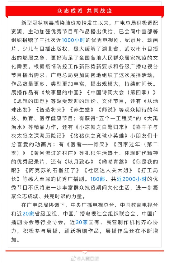 據(jù)國(guó)家廣電總局,日前已啟動(dòng)全國(guó)廣播電視節(jié)目“眾志成城 共同戰(zhàn)疫”公益展播活動(dòng)。根據(jù)安排,《大禹治水》《宇宙護(hù)衛(wèi)隊(duì)》《豬豬俠》等180余部、共近2000小時(shí)的優(yōu)秀電視節(jié)目、動(dòng)畫片、紀(jì)錄片、廣播劇將無(wú)償提供播出版權(quán),在全國(guó)各級(jí)廣播電視臺(tái)廣泛播出。