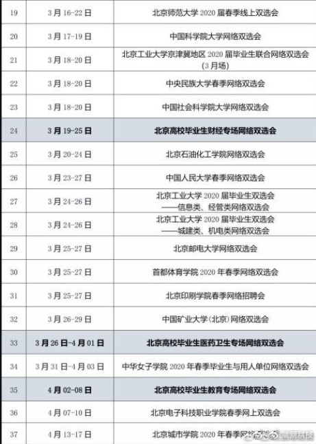 自2020年2月26日起,不同主題的網(wǎng)絡(luò)雙選會(huì)將陸續(xù)舉辦,每場(chǎng)雙選會(huì)持續(xù)時(shí)間為3-7天。