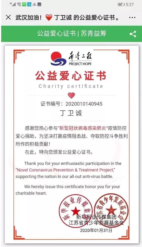 19護理丁衛(wèi)誠積極響應號召,捐出了自己的零花錢,為抗擊疫情奉獻了自己應有的力量。