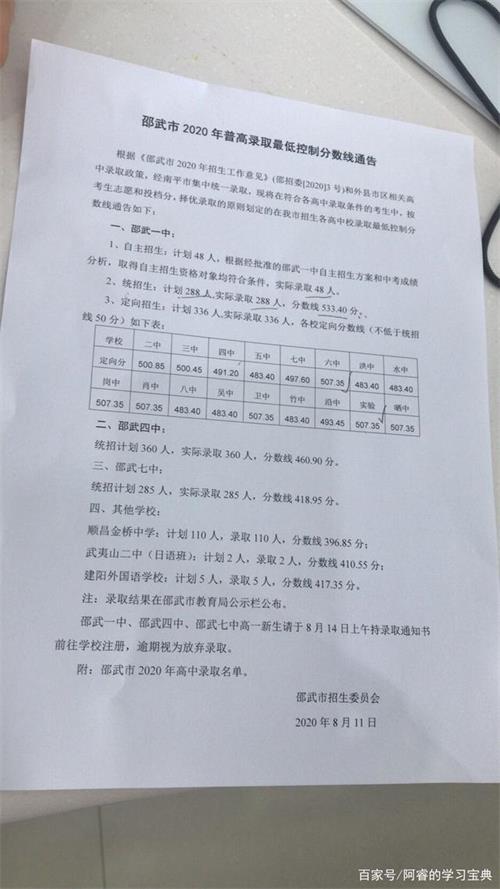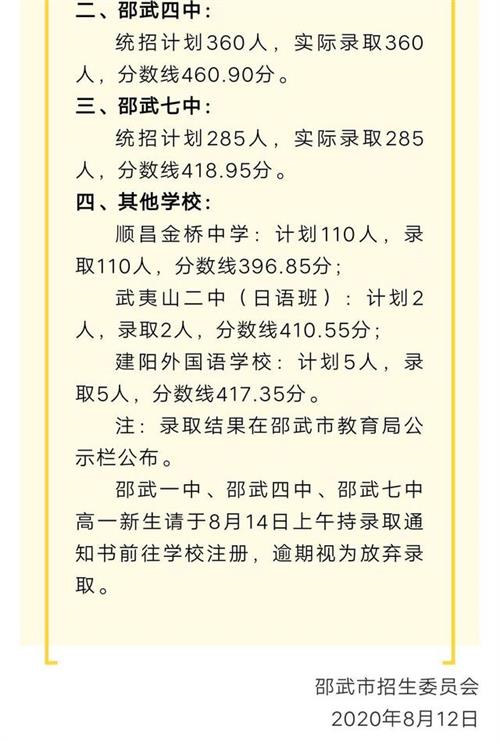 12日上午,邵武市教育局發(fā)布了本市中考錄取分數(shù)線,其中邵武一中統(tǒng)招分數(shù)線為533.4分,具體情況如下: