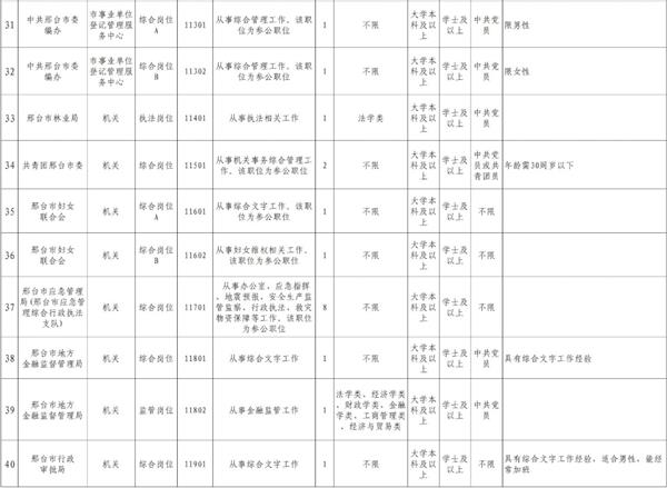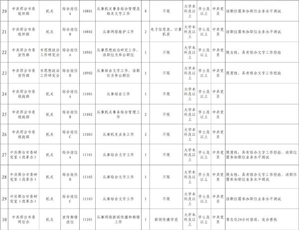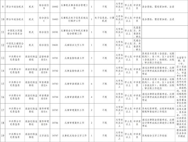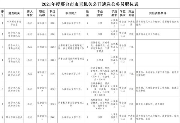 詳見附件1《2021年度邢臺市市直機關公開遴選公務員職位表》(以下簡稱《職位表》)。