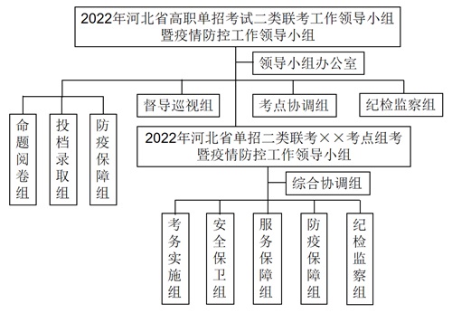 各考點分別成立“2022年河北省高職單招考試二類組考暨疫情防控工作領(lǐng)導(dǎo)小組”,由本考點院校校級領(lǐng)導(dǎo)組成,考點院(校)校長為第一責(zé)任人,考點組考工作領(lǐng)導(dǎo)小組接受聯(lián)考工作領(lǐng)導(dǎo)小組的領(lǐng)導(dǎo),負責(zé)制定本考點聯(lián)考工作實施方案和疫情防控方案,并負責(zé)全面領(lǐng)導(dǎo)、部署和實施本考點的各項組考工作。