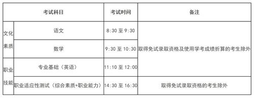 實行“文化素質(zhì)+職業(yè)技能”的評價方式,總分為750分。其中文化素質(zhì)考試科目為語文、數(shù)學(xué),每科150分,滿分300分,考試時間各60分鐘。職業(yè)技能考試分為專業(yè)基礎(chǔ)和職業(yè)適應(yīng)性測試兩部分內(nèi)容,專業(yè)基礎(chǔ)考試科目為英語,滿分100分,考試時間50分鐘;職業(yè)適應(yīng)性測試考試科目分為綜合素質(zhì)和職業(yè)能力兩部分,分別占150分和200分,滿分350分,考試時間120分鐘。