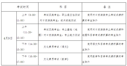 考試內(nèi)容分文化素質(zhì)考試和職業(yè)技能考試。總分為750分,其中文化素質(zhì)考試滿分300分,職業(yè)技能考試滿分450分。報考考試五類的考生職業(yè)技能考試科目為專業(yè)基礎(chǔ)考試、職業(yè)適應(yīng)性測試;報考對口旅游類的考生職業(yè)技能考試科目為專業(yè)能力測試、技術(shù)技能測試。