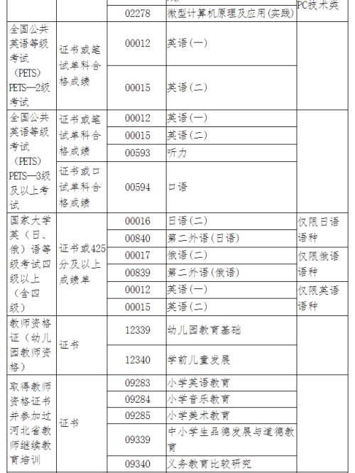 (一)“前置學(xué)歷”為專(zhuān)科的畢業(yè)生,報(bào)考河北省高等教育自學(xué)考試本科專(zhuān)業(yè),使用《學(xué)籍表》中已取得合格成績(jī)的課程,可免考除英語(yǔ)(二)(00015)、日語(yǔ)(二)(00016)、俄語(yǔ)(二)(00017)、概率論數(shù)理統(tǒng)計(jì)(經(jīng)管類(lèi))(04183)、線(xiàn)性代數(shù)(經(jīng)管類(lèi))(04184)以外的課程名稱(chēng)、內(nèi)容相同或相近的公共課及計(jì)算機(jī)基礎(chǔ)課。