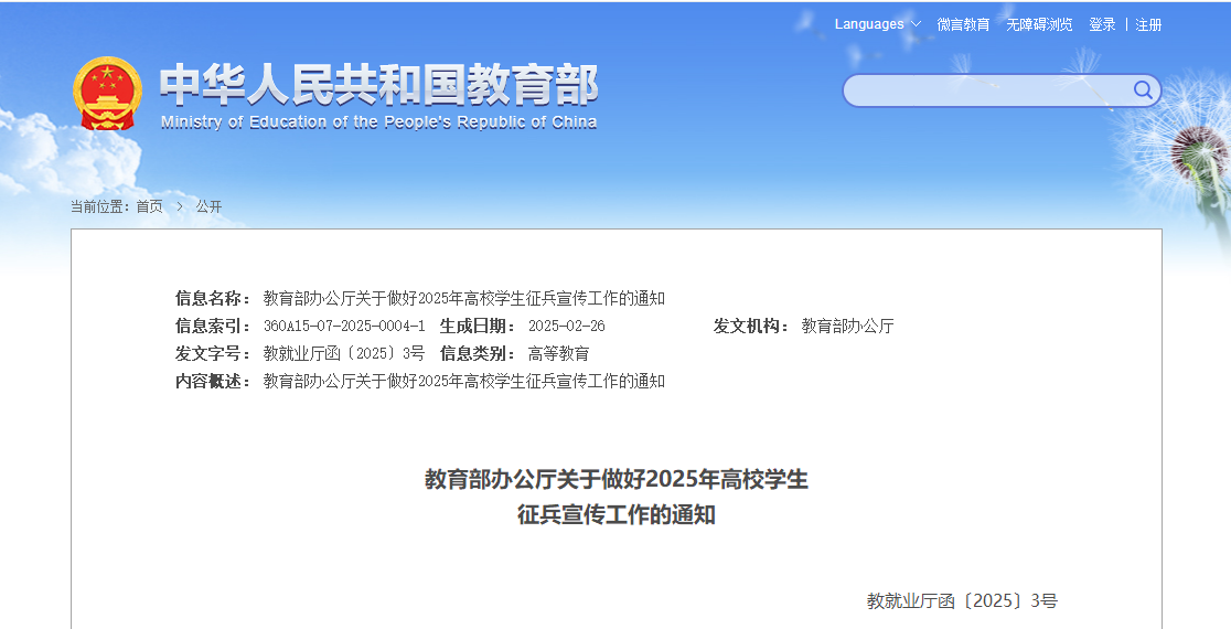 為深入貫徹習近平強軍思想,全面落實黨中央、國務院、中央軍委關于新時代征兵工作的決策部署,進一步激發(fā)高校學生參軍報國熱情,高質量完成2025年征兵任務,現就做好高校學生征兵宣傳工作有關事項通知如下。