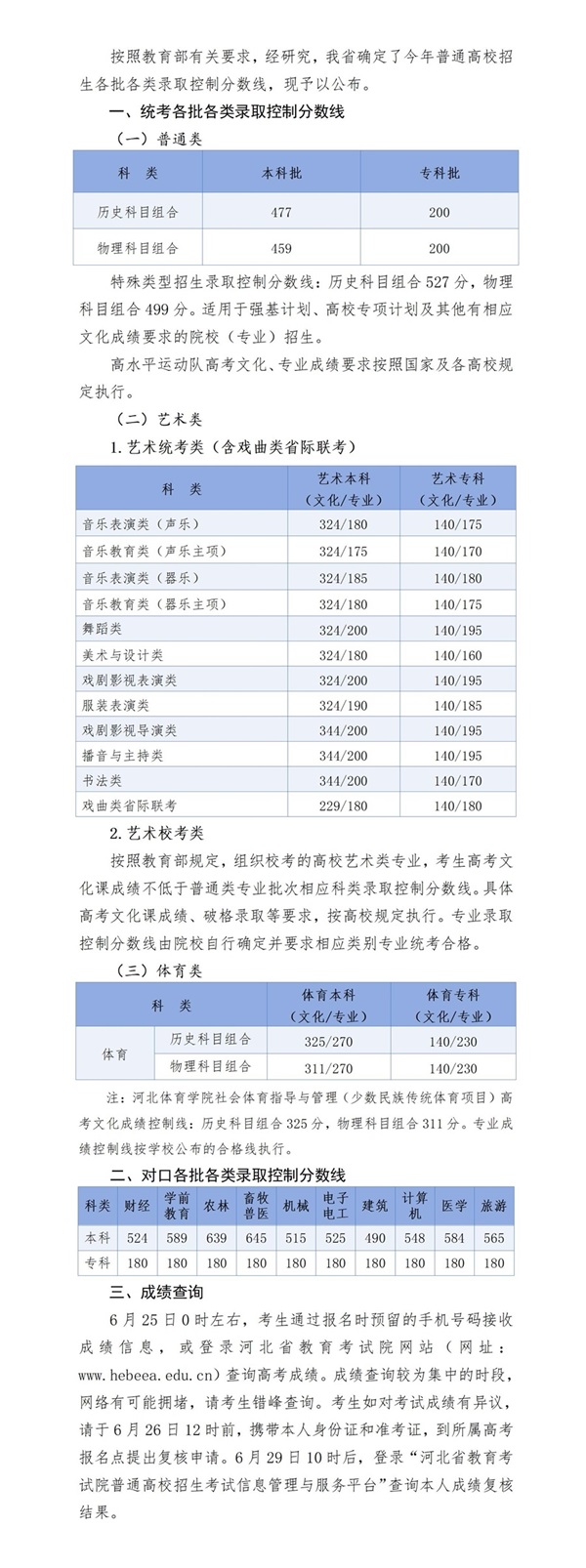 2025年河北省普通高校招生各批各類錄取控制分?jǐn)?shù)線